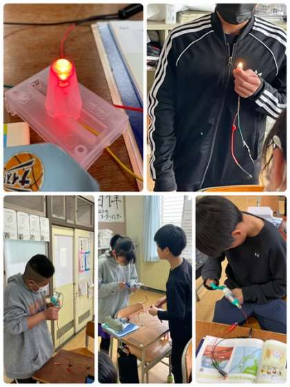 豆電球は、少しの時間で消えてしまいましたが、発光ダイオードは、1時間以上光り続け、使用される電気量の違いによって、光る長さが変わってくることを知りました。