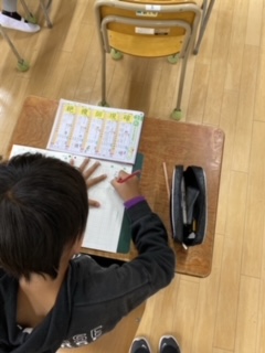 五年生初めての国語。漢字や音読をしました。現、確という字を丁寧に、姿勢に気をつけて、ゆっくり書きました。