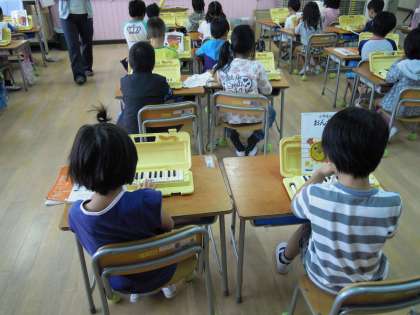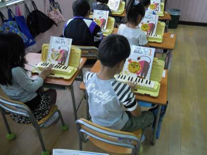 いよいよ音楽科で鍵盤ハーモニカの練習が始まりました。歌「どんぐりさんの おうち」に合わせて、「ド・ド・ドー」「ソ・ソ・ソー」と指を動かしながら弾いています。リズムをとるのが上手な子が多く、ほとんど音がずれたり、休むところで吹いたりする子がいないのでこの調子で練習をがんばってくれたらなと思います。