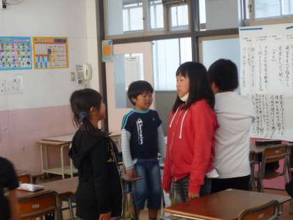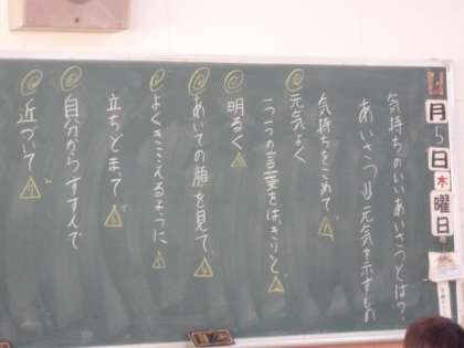 など、たくさん意見が出ました。時間の最後、「気持ちのいいあいさつをしてみよう!」ということでクラスの友だち5人にあいさつをしました。