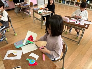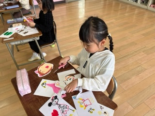 図画工作科の時間に、クレパスを使って好きなものをかきました。食べ物や好きなキャラクターなど、たくさんかくことができました。1年生の好きな食べ物で多かったのは、スイカでした。