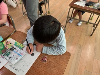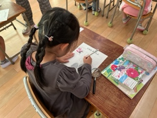 1年生は、生活科であさがおを育て観察する学習があります。今回は「種をよく見てみよう」ということで、虫メガネを使って観察し、ワークシートにかきました。「形が少しずつちがう」「色は黒」などと言いながら、集中してかいていました。