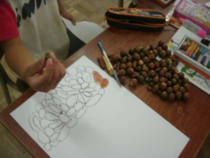 さっそくこのどんぐりを使って、図工の時間に絵を描きました。