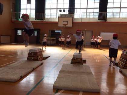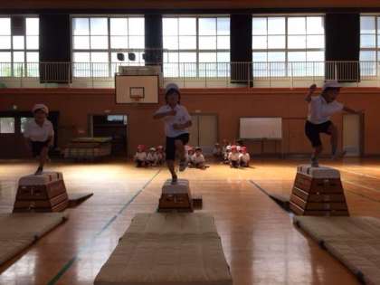 体育の時間にとびばこあそびをしました。とびばこをいろんなかたちで跳び越えたり、またがって進んだりしました。最初は片足でふみきり、とびばこをけって両足で着地をしました。楽しんでいろんなポーズをしながら跳んでいました。にんじゃ修行をやり遂げた1年生はさすがです。そのあとはとび箱にとびのってまたぎおりをし、実際に跳んでみました。運動会の馬跳び練習が活きた様子で、普通に跳んでいる子がたくさんいたので驚きました。