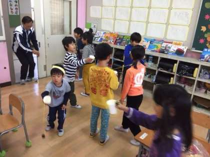 秋も深まり、木々の葉が色づき始めるようになりました。落ち葉の色は様々です。イチョウはまだ緑色、さくらは赤や黄色やそれがまざったいろなどがあります。今日はそれを紙コップにはりつけて、毛糸で結んだ松ぼっくりをつけた「秋のオリジナルけんだま」をつくりました。とてもとても喜んで遊んでいました。いろんな遊び方をすぐに思いついて見せてくれる様子を見て、子どもは遊びの天才だなと感じました。