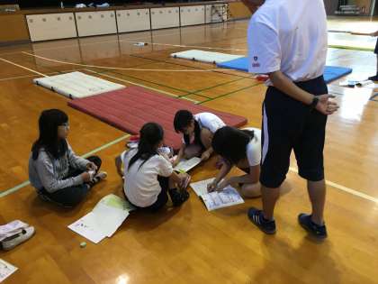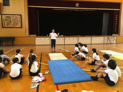 開脚前転、開脚後転、側転、頭倒立など、難しい技を、友達とアドバイスしながら練習しています。