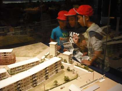 また、戦後の大阪の街並みの模型がたくさん展示されていました。ちょうど城北の地域の展示があり、子どもたちは今との違いをじっくり観察していました。