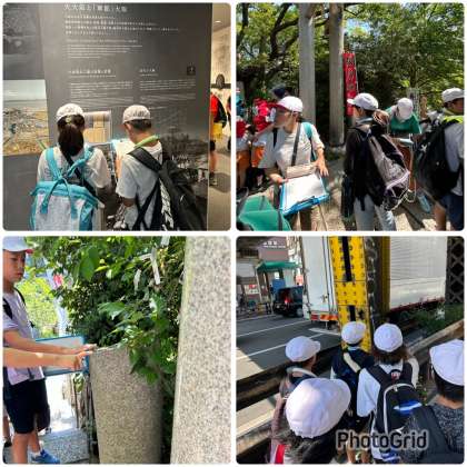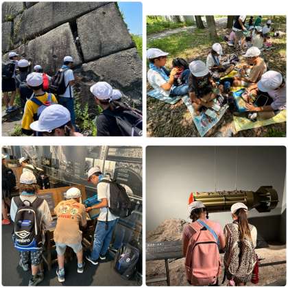 大阪大空襲の被害のあった地域を巡りました。玉造鉄橋の弾痕跡、真田山陸軍墓地、ピース大阪、大阪城周辺の戦跡を巡りました。子どもたちは、暑い中、真剣にワークシートにメモをとりながら、話を聞いていました。その調子でまとめ、振り返りも頑張りましょう。