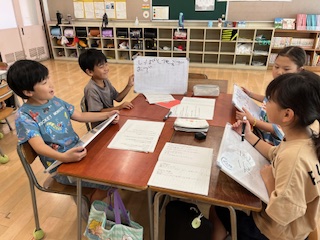 司会を決めて話し合いをしています。友だちの意見を聞いて、いいねと褒めあったり、似ているところを見つけあったりしながら、熱心に取り組めています。