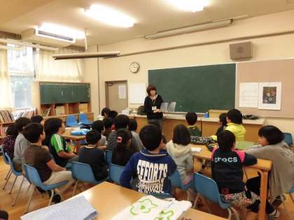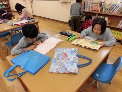 みんな読書が大好きなので、図書室に行くと自分の読みたい本をさっと探して、自分の机で黙々と読み始めました。その後、学校図書館補助員の方に読み聞かせをしていただきました。「あらしのよるに」という本で、嵐の夜に子ヤギと狼が一つの小屋に来る話です。夜なので、お互いの顔が見えず、お互いの正体がわからないまま話が進んでいく話です。時折、正体がわかりそうな会話になったときに、