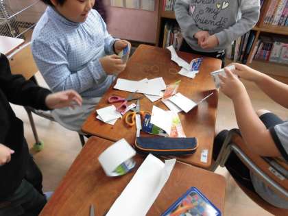 もの作りパーティーとは、話し合いの練習の中で実施することに決まったパーティーです。それぞれの班が自分たちの出し物に必要なものをそろえて準備していました。