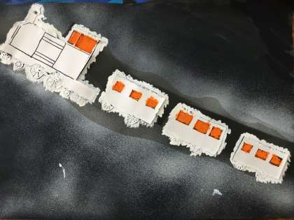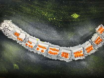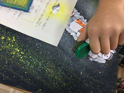 または、ブラシをあみにこすりつけると、下に細かい絵の具の粒が落ちてきます。