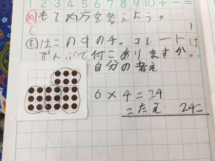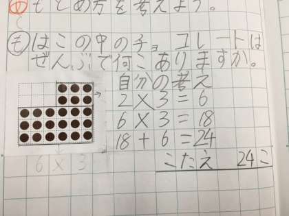 今日は、こんな形にならんだ●の数をかけ算を使って求める学習をしました。最初見たときは、どうやったらいいか悩んでいた子どもたちですが、同じ数ずつに分ければできるということを思い出し、自分の力で考えてみました。