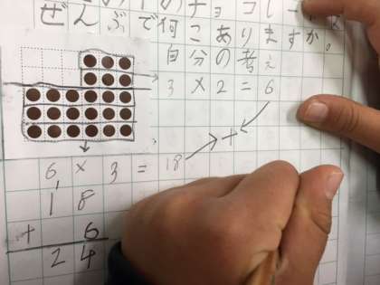 算数のかけ算の学習では、今まで学習してきたことを使って問題を解いています。