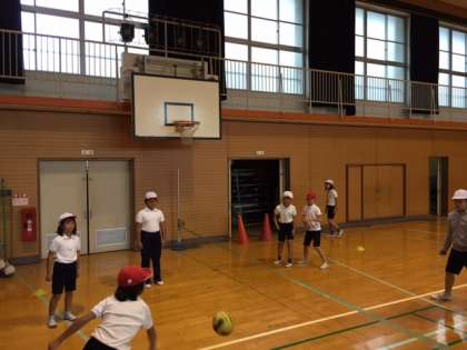 今週から体育では、3.4年生合同でプレルボールをしています。