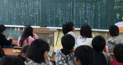 黒板にギッシリと書かれた応援の言葉。それらをみんなでまとめて、伝えたい言葉を決めていきました。