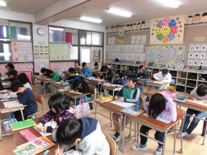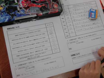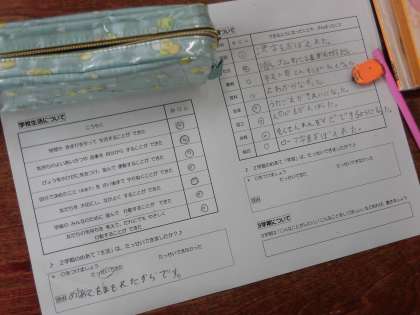 学習のことや生活のことで2学期の初めに決めためあてを達成できたか、守れたかを振り返りました。二重丸をつけて「できた!」という子も多かったです。三角がついたものについては、ここからがんばろう、と気持ち新たにしていました。