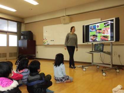 クリスマスが近づいてきたということで、ギャビー先生の出身であるオーストラリアのクリスマスの様子を写真を交えて話してくださいました。その後、クリスマスに関するものでビンゴゲームをしました。子どもたちも大盛り上がりで、ビンゴがそろって先生とハイタッチ!
