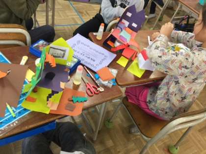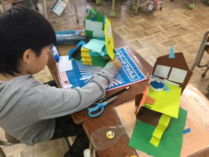 自分の考えるすてきなお家が続々と出来上がってきています。完成にはまだ時間がかかりそうですが、作品展には立派なお家が並びますよ♪♪