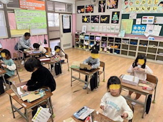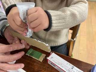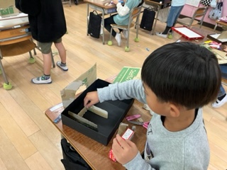 どんぐりや落ち葉、ダンボールなどを使って、めいろ作りをしています。おもしろいコースを作るにはどうすればいいのかを考え、工夫して作っています。ボンドをつける作業も、一学期と比べ随分上手になりました。出来上がりが楽しみです。