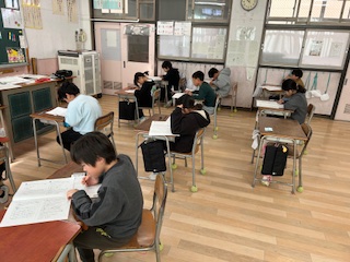 社会では、地図やグラフ、写真などの複数の資料を読み取って答える問題などがあり、問題用紙に印をつけながら、考える様子が見られました。