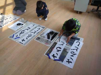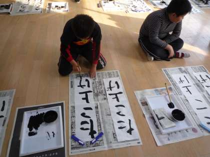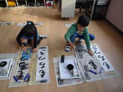 の4つの中から自分たちで選んで、教室で書きました。机をだし、いつもより大きな紙に四文字ということで、難しいかな、と思われましたが、子どもたちはとても上手に書いていました。