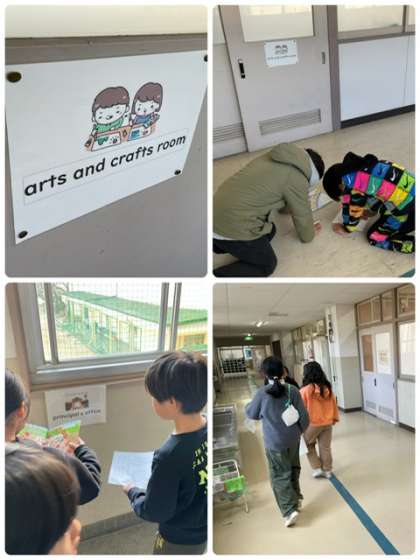 今日の外国語活動では、校内に英語で掲示されているさまざまな教室を探す活動をしました。