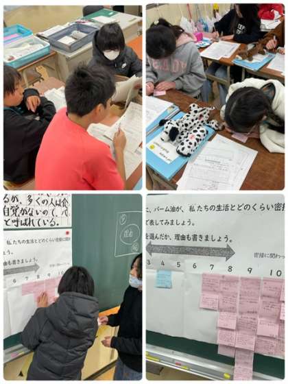 今回の授業では、パーム油が自分たちの生活にどれぐらい関わっているのか、理由も書いて、10段階の数値で表しました。
