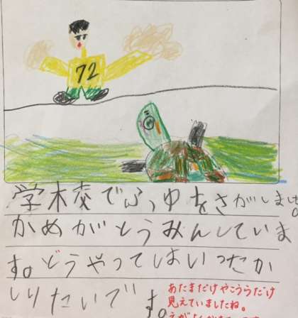 せいかつの時間に学校に冬さがしをしました。夏や秋と違って、あまり生き物の気配がしない校庭。でも目を凝らして探してみると、桜の冬芽が芽吹いていたり、水たまりが凍っていたり、カメが冬眠していたり、おもしろいものがたくさん見つかりました。寒い中、もっと探したいと元気よく取り組んでくれました。来週は外の公園にも出かけて探しに行きたいと思います。