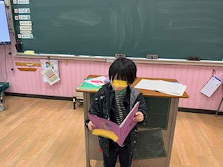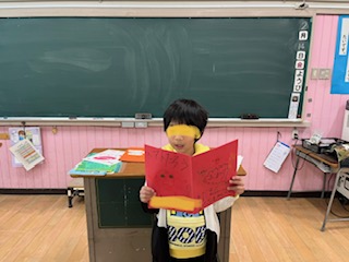 「ももたろう」や「はなさかじいさん」などを参考に、お話に出てくる人物を考えて、自分だけのお話をかきました。「水たろう」や「ねりけしたろう」などおもしろいお話がたくさんできました。廊下に掲示していますので、参観の際には是非ご覧ください。