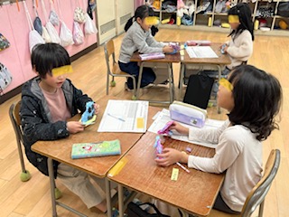 学校にあるでこぼこを紙粘土で型押しし、顔や土台をつけて「ともだち」をつくる活動をしました。また、完成したともだちに名前をつけたり、好きなものを考えたりしました。最後に、粘土のともだちを紹介して遊びました。