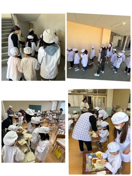 今年から1,2年生は同じ教室で給食を食べています。1年生は初めてで慣れないですが、2年生のお兄さん、お姉さんの動きを見て頑張っています。6年生も助けに来てくれていて、準備もとてもスムーズです。みんな「おいしい!」と言いながら喜んで食べています。