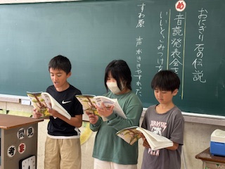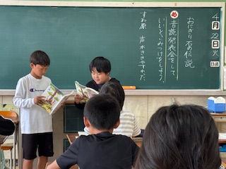 5年生初めての物語「おにぎり石の伝説」の文章の音読発表会を行いました。読み取ったことをどう表現するか、グループで相談し、声に表情をつけて読んでいました。どの班も素晴らしい音読で聞いていてとても楽しかったです。