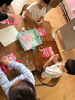 図画工作科の時間にこいのぼりの制作をしました。お花紙をうろこにみたてて、ペタペタ。大きく貼ったり、細かく貼ったり、素敵なこいのぼりができあがりました。