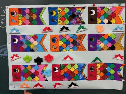 もうすぐこどもの日ということで、こいのぼりにクレパスでていねいに色をぬりました。それぞれカラフルですてきなこいのぼりになりました。玄関の掲示板に飾っているので、参観の際にはぜひみてください。