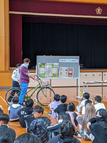 旭警察署の方に来ていただき、自転車の安全な乗り方や、信号の渡り方など学びました。