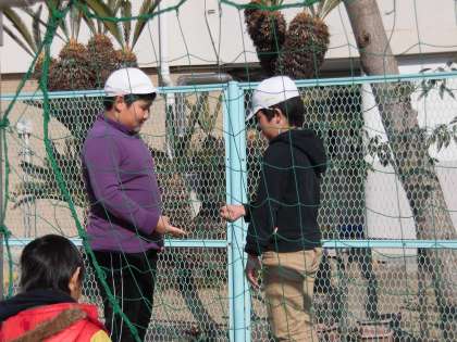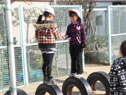 タイヤの上を両側から歩いていき、出会ったらじゃんけん。負けたら道を譲り、負けたチームの次の人がスタートする。そして、最後まで渡りきれたら1ポイント。最終的にポイントが多いチームが勝ち、となります。スタスタと難なくタイヤの上を歩いていく子もいれば、バランスがとれずゆっくり進む子もいました。しかし、はやくてもじゃんけんに負けたら交代なので、一進一退の攻防でした。