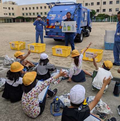 大阪市職員の方から、ごみの分別や、フードロスの話しなど聞かせていただきました。パッカー車のごみ収集の仕方や仕組みについても教えていただきました。