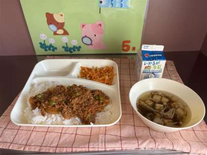 5月21日(水)の献立は、「ごはん、牛乳、タコライス、とうふともずくのとろり煮、にんじんしりしり風」と沖縄料理が勢ぞろいでした。レバーは苦手とする子が多い食べ物ですが、今日のタコライスのように細かくし、ひき肉に混ぜて炒めることで、みんなパクパク食べることができていました!レバーには目をよくしてくれるビタミンや血を作る鉄分が含まれています。おうちでもぜひ取り入れてみてくださいね。