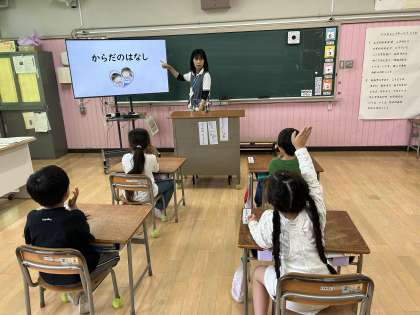 今日、体の話について養護教諭の歌門先生から教えていただきました。自分の体は、自分だけのものであることやプライベートゾーンについても学びました。もうすぐ、プール水泳が始まります。着替えの仕方も学習していきましょう。