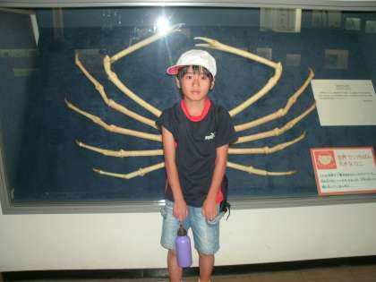 「先生どうやー」と、大きなカニの前に立つ少年(笑)
