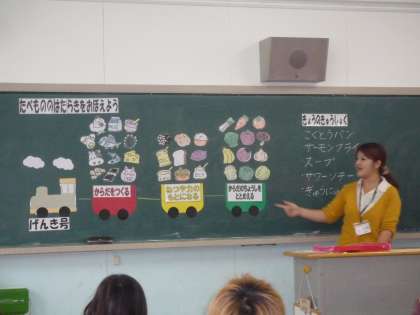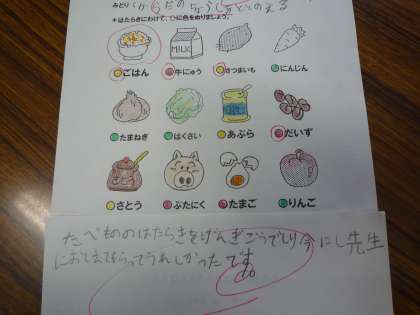 栄養教諭のいまにし先生をお迎えして、「たべものを3つ(のはたらき)にわける」学習をしました。