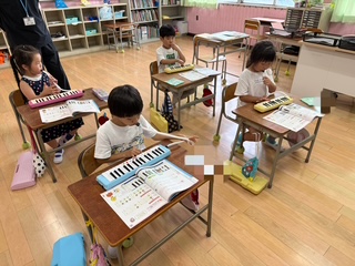 先週から音楽科の時間に鍵盤ハーモニカの学習が始まりました。息の練習や指番号を覚えました。「ド」と「ソ」位置を覚えたあとは、みんなでしっかり息をあわせて「どんぐりさんのおうち」を吹くことができました。これからもみんなでたくさん練習しましょうね。