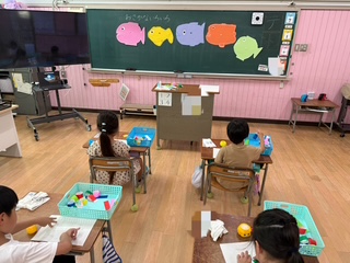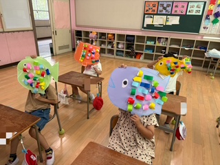 図画工作科の時間におさかなをつくりました。おりがみをいろいろな輪っかにして、うろこにしました。個性豊かなおさかなの完成です。次回は、海の生き物たちをつくります。