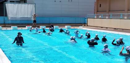 ふだんの水着での授業と違い、服を着て水に浮く訓練をしました。