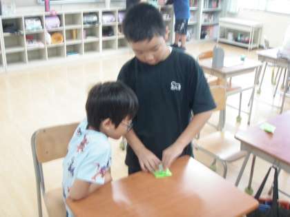 たてわり班に分かれて折り鶴の折り方を6年生から教えてもらいました。