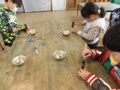高学年図工室に行き、くぎうちの練習をしました。とんかちを持ち、くぎを木に当てて打ち始めます。必ず立ってやることを声かけしてやっています。
