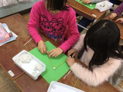 今日は、「ひご」と「ねん土玉」を使って、はこの形作りに挑戦しました。
