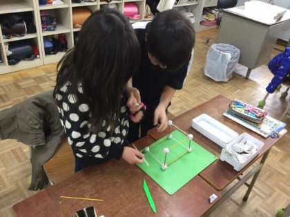 ひごの長さや本数は、みんなばっちり合っていましたが作るとなると、なかなかひごがまっすぐ立たずに大苦戦でした^^