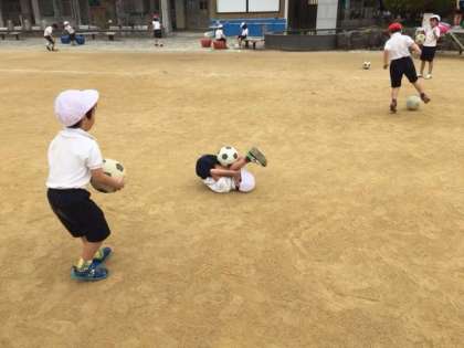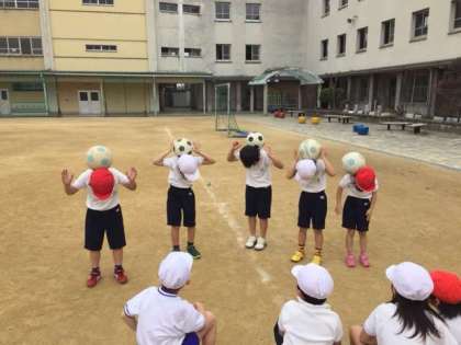 最近の体育では、ボール遊びを取り入れています。今日は、体を上手に使ってボールを乗せる遊びをしました。頭、首、おなかや足の裏まで、「見て見て」と楽しみながら遊んでいました。中でも首に乗せるのが上手な児童がたくさんいました。まったく動かずに姿勢を保つ様子が面白かったです。